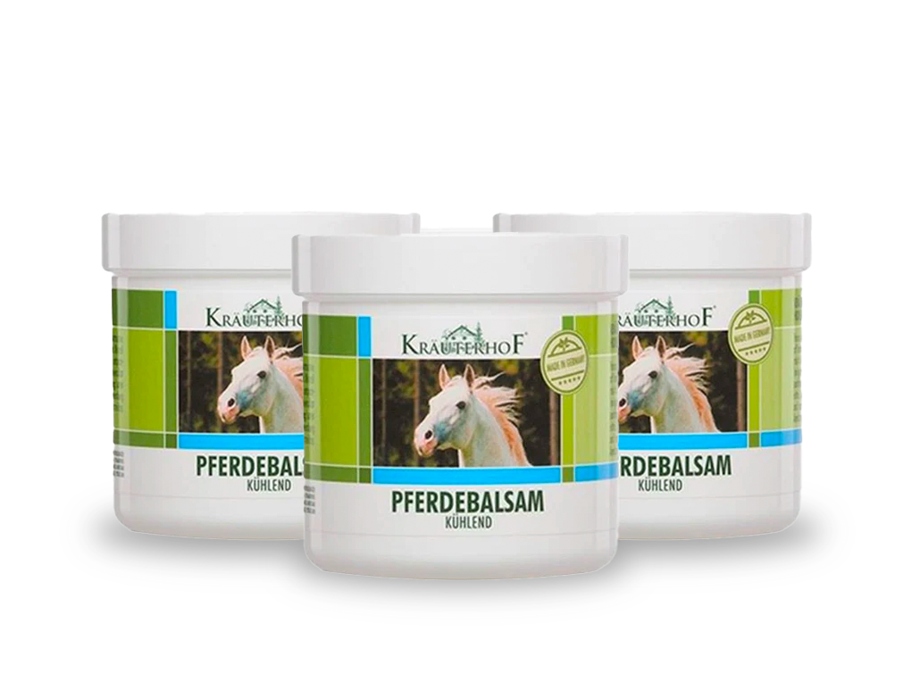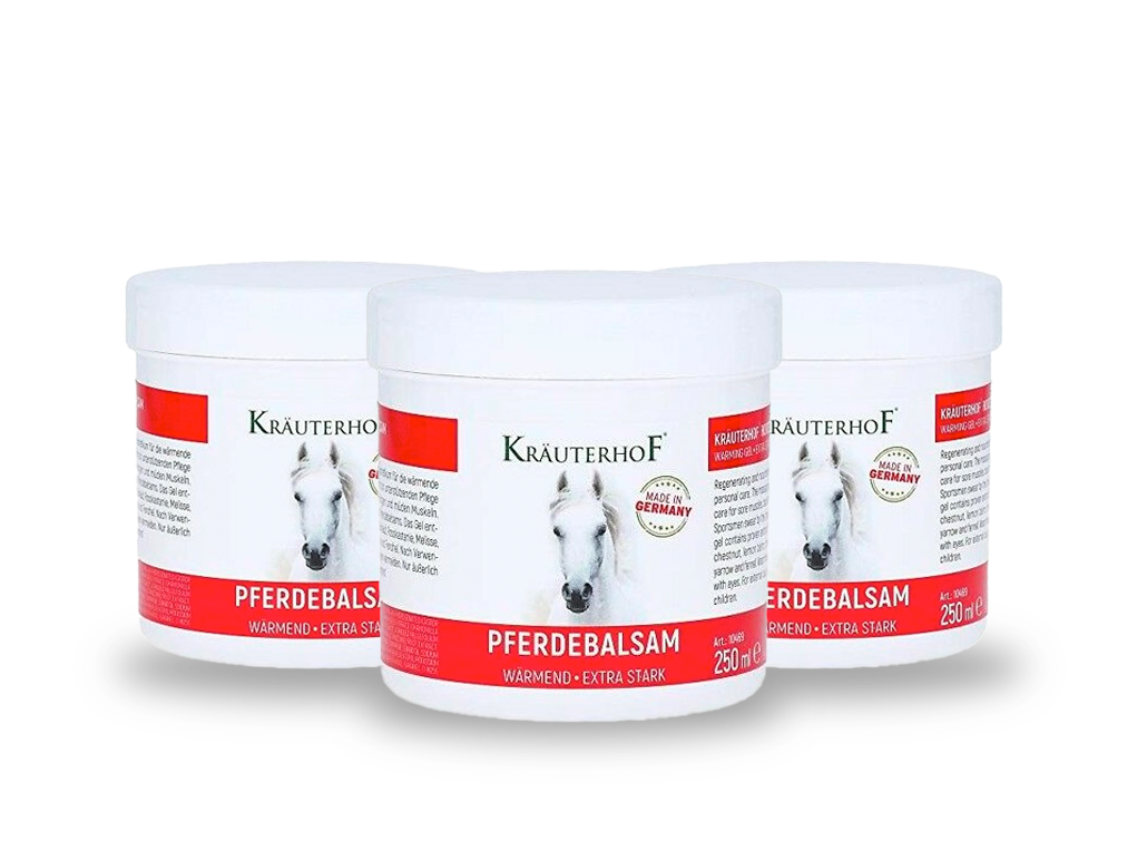 - Bálsamo de Cavalo – Kräuterhof – 500ml- O Pferde Balsam (conhecido como Bálsamo do Cavalo) é um bálsamo que ativa a atividade sanguínea e aquece a pele cansada e dorida, após esforço físico ou muscular. - É recomendado para aquecer e dar uma sensação de alívio e conforto nas zonas musculares logo a seguir ao trabalho, aos treinos desportivos e atividades físicas intensas. - Bálsamo muscular de efeito quente.